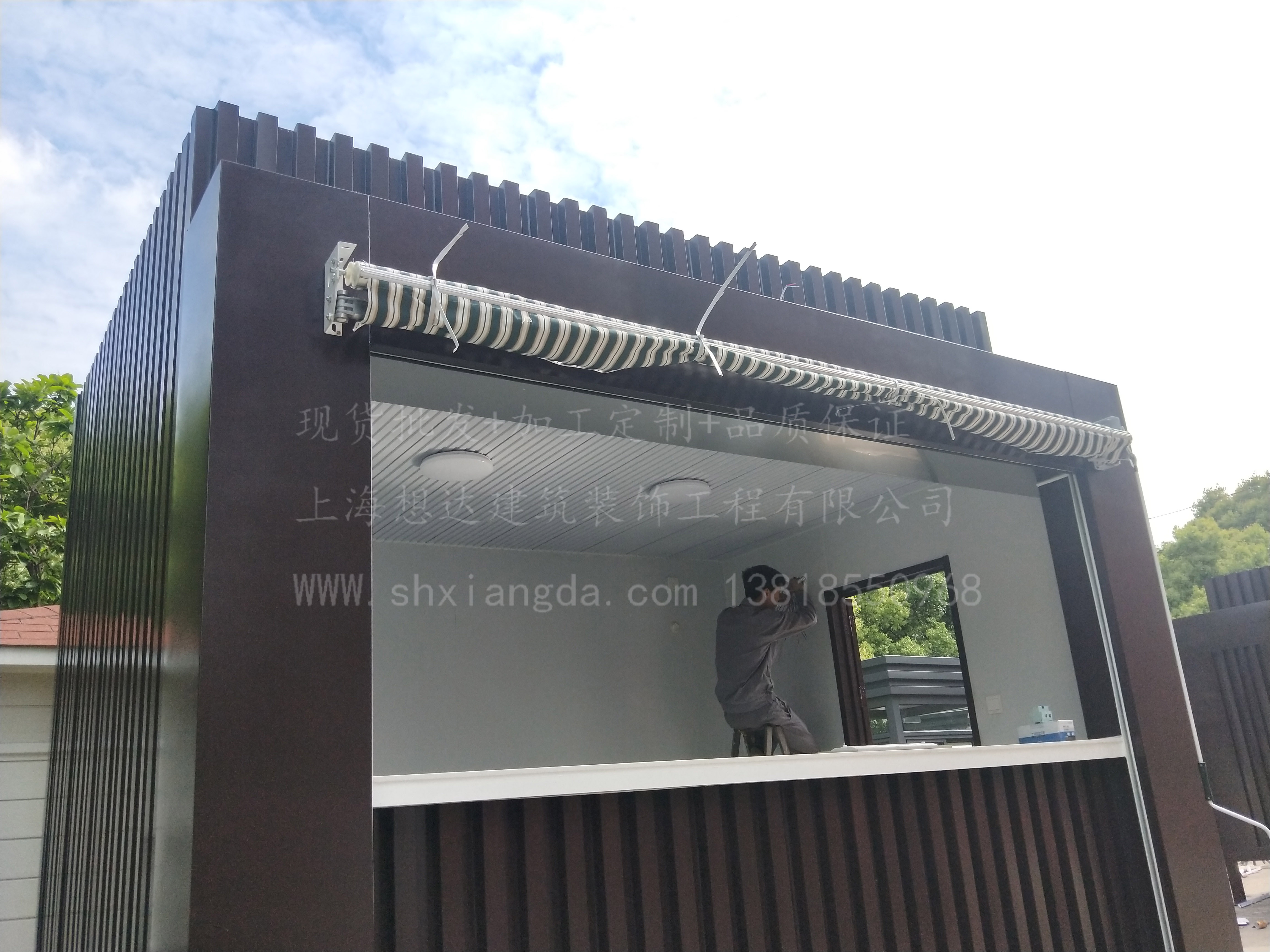 立柱采用100*100*2.5d鍍鋅方管焊接而成,整體鋼結(jié)構(gòu)骨架,抗震防風。外墻采用鍍鋅板折邊成型,內(nèi)搭3mm鋁塑板,吊頂為16mm金屬烤漆雕花板吊頂。